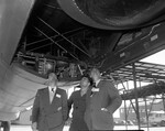 Three men stand underneath a large machine. This photo was taken at the Associated Press Managing Editors Association at Carswell Air Base.