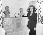 Electra Waggoner Biggs, shown with sculptures she did for first Southwestern exhibition showing at Small Fry Shop, 6th Ave., Fort Worth; small marble bust is Neil McConnell, grandson of Mrs. B.L. Anderson of Fort Worth, 11/07/1947
