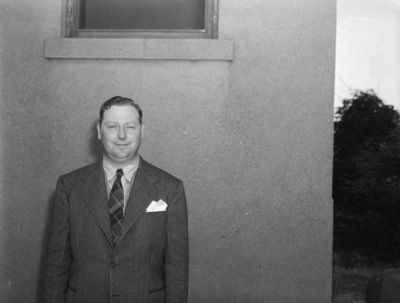 D. E. Flory has been an employee in the beef department of the Armour and Company for eighteen years. He is resigning from the department after accepting a position with the Department of Agriculture. Mr. Flory will work in the beef inspection department, a branch of the Agricultural Marketing Service. He will undergo training in Los Angeles, California before being assigned to San Francisco, California. Mr. Flory is standing against a wall dressed in a suit.