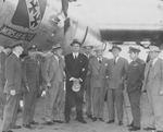 In Fort Worth, U.S. Cabinet officers and members of Congress prepare to fly in a newly manufactured B-36 bomber; key persons include Air Secretary Stuart Symington, fourth from left; Sen. Lyndon B. Johnson, fifth from left; and Amon Carter, sixth from left [other names inluded on back of photograph]. The 7th Bomb Wing's motto "Mors Ab Alto" is seen on the side of the plane, 11/20/1949