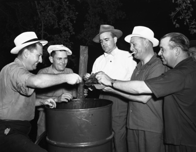 The Forest Park Zoo is hosting a barbecue in Lake Worth to help fund the zoo's baby elephant, Cutie Pie. Eighty friends of the zoo are attending the barbecue hosted by Director Hamilton Hittson. Huddling around a drum left to right are. Mr. Hittson, Walter Kennedy, Langford Carlton, Oliver Shannon, and Roy Hilts.