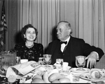 West Texas Chamber of Commerce Annual Dinner at Hotel Texas. Tom Connally to the right siting with a woman. Curtains and the US flag is seen in the back.