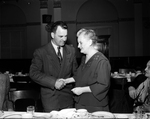 Thanksgiving Dinner for News Vendors. A man is seen shaking a womens hand at the thanksgiving event. In the background you can see silverware and another table .