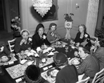 Party at Amon Carter home for Countess of Maille. A group of women seated at a table with Minnie Meacham Smith Carter at the head of the table and Claire Clemence, the countess of Maille, to her right. There are flowers as the centerpiece of the table.