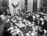 Party at Carter Home for Countess of Maille. A group of women seated at a table with Minnie Meacham Smith Carter at the head of the table on the left side of the photo. There are flowers as the centerpiece of the table. The back wall is covered in mirrors with a fireplace barely seen. To the left a patio is shown with curtains.