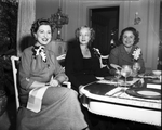 Three women are shown attending a reception in the home of Amon and Mrs. Carter. From left are Luisa Kriendler, Mrs. Amon Carter and the Countess Clemence. The women are seated at a a dining table upon which sits tableware and water glasses. All three are wearing suits and corsages. Behind them on the wall is an electric wall sconce.