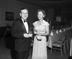 Mrs. W. C. Stripling's birthday party. A man and woman are seen taking a photo before the dinner in the main room. They are both holding a glass with the dinner table behind them. On the back left wall a painting is shown.