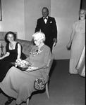 Mrs. W. C. Stripling's birthday party. Mrs. Stripling is sitting down with a present in hand with her daughter standing to the right. The man and woman to the left are unidentified.
