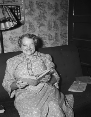 Mrs. Alven Lumley is a specialist in bean dishes. She can recommend a recipe for a pie, salad, and even a cake. She is shown sitting on her couch, reading a book. She is wearing a floral dress with buttons down the front. There is calendar hanging on the wall.