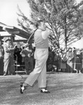 Bob Hope hitting the ball with a rubber driver, Ben Hogan and W.A. Moncrief in background at River Crest Country Club.