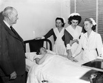 State Sanatorium School of Nursing in care of tuberculosis patients; student Jewell Jackson with patient Donna Lee Atkinson; Dr. J.B. McKnight, superintendent of the school; Nursing Supt. Audra Mathison (right) and student Edna Hopper, 12/07/1949
