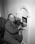 Mayor Barney C. Barnes, Arlington, Texas, using a new dial telephone.
