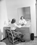 Mrs. John McCann, wife of manager of the Loring Hotel, at combination desk and dresser inside one of the guest rooms, 12/14/1949