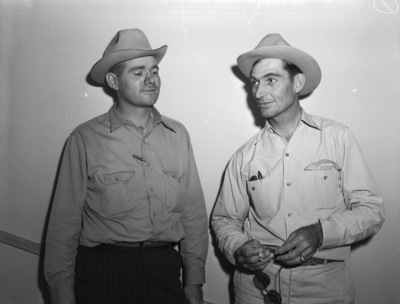 Midland, Texas, is hosting their sixth annual rodeo and horse show. Taking prominent roles in the rodeo left to right are, V. G. Young, and George Glass. Mr. Young is a country agent. He is wearing a cowboy hat, button-up shirt, and trousers. Mr. Glass is the manager of the colt show, which has more than a hundred entries. He is dressed in a cowboy hat, western shirt with pearl buttons, and trousers.