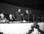 Number I. Dinner for General Dwight D. Eisenhower, given by the Chamber of Commerce. Left to right until the podium is Amon Carter, Dwight Eisenhower, Roger Ramey and Web Maddox. Ramey is receiving the the distinguished service award from Maddox.