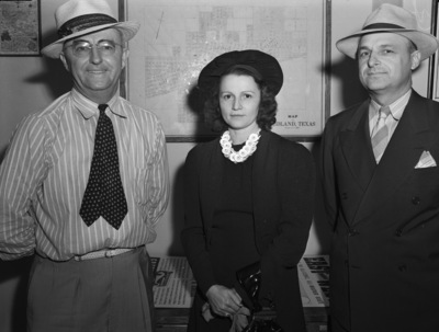 Midland, Texas, is hosting their sixth annual rodeo and horse show. Taking prominent roles in the rodeo left to right are, Chappel Davis and Mrs. and Mr. H. B. Pyle. Mr. Davis, of Midland, is the chairman of the Gaited Horse Show. He is dressed in a hat, striped button-up shirt, necktie, and trousers. The Pyles are from Houston, Texas. Mrs. Pyle is wearing a hat, dress, necklace, and a blazer. Mr. Pyle is judging many of the entries in the gaited class. He is dressed in a hat, double breasted suit, and a pocket square. There is a map of Midland, Texas, hanging on the back wall.