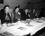 Number II. Dinner for General Dwight D. Eisenhower, given by the Chamber of Commerce. These women are shown sitting down eating and looking off frame. There seems to be a picture that has a prop to it that everyone at the table can see it.
