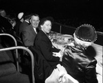 Number II. Dinner for General Dwight D. Eisenhower, given by the Chamber of Commerce. Another couple is the main focus of this photo. They are both looking at the camera and have finished eating. The people around them are looking out of frame towards something else.