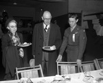 Number II. Dinner for General Dwight D. Eisenhower, given by the Chamber of Commerce. An older couple is finished eating their empty plates. The usher is pushing in their chairs.