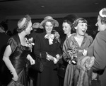 Party given by Mrs. J. Lee Johnson III for Mrs. Dwight D. Eisenhower. A group of women are shown together with Mrs. Amon Carter to the far left of the group. She is looking at the woman in the middle while the woman to the right is doing the same.