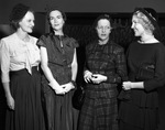 Party given by Mrs. J. Lee Johnson III for Mrs. Dwight D. Eisenhower. Another group of women is shown. The middle pair are seen looking off frame while the outer two look towards each other.
