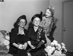 Party given by Mrs. J. Lee Johnson III for Mrs. Dwight D. Eisenhower. This group of older women are seen together. The women on the right is smoking, middle is holding her glasses, and the left is holding an unidentifiable object.