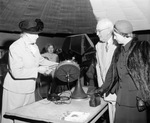 Dedication of Charlie M. Noble Planetarium, Fort Worth Children's Museum; Charlie M. Noble explains projector to J. Lee Johnson Jr., museum president, and Mrs. Edwin T. Phillips, president of Fort Worth Junior League, 12/19/1949