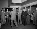 Third floor Christmas party. To the far left is Amon Carter Jr. They seem to be being handed a object by the man in front of the group. All men seen seem to have a special pin above their front pocket