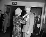 Third floor Christmas party. An unidentified woman is seen putting a pin on Amon Carter. Seen in the background is multiple women.