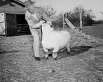 Sam Murrell, a visiting sheep fancier and breeder of Lancaster, Montana, checks the age of one of Mrs. Wilson's Hampshires.