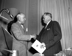 Salesmen's Banquet. Series. Amon Carter is seen shaking a unidentified man's hand. In the other man's hand is a pamphlet of the event.