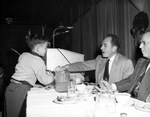 Salesmen's Banquet. Series. Two unidentified men are sitting at the table. The man to the right is seen shaking a young boy's hand. In the background the podium is seen with no one speaking at the moment.