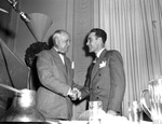 Salesmen's Banquet. Series. Amon Carter is shaking a unidentified man's hand next to the podium.