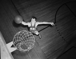 Getting High -- Raymond Barnes, Texas Wesleyan's starting junior forward from Poly High School, was up near the basket dropping in a crip shot-when Star-Telegram Photographer Tom Dillard visited the Rams' workout recently and made this unusual shot. Raymond, basketball player shown in action. He is in uniform and dunking a basketball into the hoop. His player number is 22. Barnes, a six-foot three-inch(6-foot 3-inch) athlete, has made twenty (20) points in two Texas Conference games and the Wesleyans will count on him to come through again Friday night in an all-important game against Howard Payne. Published in The Fort Worth Star-Telegram morning edition, February 9, 1940.