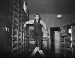 Frank Tolbert is a sports writer at the Fort Worth Star-Telegram. He is demonstrating his hurdling technique as he jumps over a footstool in the archives department. There are bookshelves on either side of Mr. Tolbert filled with thick archive binders. Mr. Tolbert is wearing a dress shirt, necktie, vest, and trousers. His suit jacket was discarded onto one of the shelves.