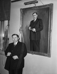 A framed painting of Clyde Eastus is hanging on the wall. He is depicted wearing a three piece, double breasted suit and holding a cigar. Mr. Eastus is standing next to the painting, mimicking his pose. He s a prosecutor with the district attorney's office. He famously worked on the pursuit of Bonnie and Clyde.