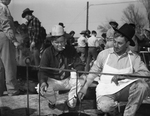 In Prominent Roles at Stockmen's Meeting -- S. R. Ikard and Van D'Hanis, who fried the steak that was served at the annual meeting of the Pecos Valley Livestock Protective Association. Behind them are other meeting attendees. Both men are wearing collared shirts, trousers and hats. Mr. Ikard is smoking a cigarette and Mr. D'Hanis is wearing an apron. Published in The Fort Worth Star-Telegram morning edition January 23, 1940.
