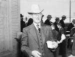 At Pecos Valley Livestock Meeting --Jim Thornton, Monahans, Texas ranchman, at the Pecos Valley Livestock Protective Association annual meeting. He is wearing a suit and hat and enjoying a slice of bread and a barbecued rib. He is smiling for the camera. Standing behind him are other meeting attendees. Published in The Fort Worth Star-Telegram morning edition, January 24, 1940.