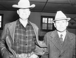 Standing left to right are Rex Rey King, vice-president of the Pecos, Texas 4-H Club, and County Agent Ted Johnston. They are at the annual meeting of the Pecos Valley Livestock Protective Association. They are posing for the photo. Mr. King is wearing a plaid shirt, trousers, coat and eyeglasses. Mr. Johnston is wearing a suit. Both men are wearing hats.