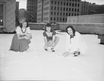 Models for the National Fashion Exhibitors at Hotel Texas don't intend to let the Weather Man interfere. These girls slipped off from work long enough for a romp in the snow attired in their summer clothes. Left to right, they are Miss Elizabeth Garrett, Miss Louise Lackey and Miss Georgia Adams. Miss Garrett is wearing a dress, Miss Lackey is wearing a swimsuit and Miss Adams is wearing a suit. Published in Fort Worth Star-Telegram, morning edition, January 23, 1940.