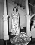 Camilla Beall is dressed in a sequined gown and a crown. She is posing on a staircase landing. The train of her dress is draped across the bottom steps.