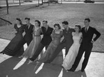 Students in Fort Worth, Texas public schools are no longer dragging their feet when it comes to dancing in physical education classes. Students from Riverside High School are performing the Ten Pretty Girls Step. The are left to right, Onieta Ore, Ben O. Keeton, Billie Hodges, Jack James, Glydeen Butterfield, Lorayne Griffin, Frankie Bess Williams, and Ben Reeves. The group is standing in a line with their arms linked and their right legs raised. The boys are dressed in suits and the girls are wearing gowns. They are dancing outdoors. Published in the Fort Worth Star-Telegram morning edition, February 4, 1940.