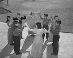Students in Fort Worth, Texas public schools are no longer dragging their feet when it comes to dancing in physical education classes. Riverside High School are practicing an old-fashioned square dance. The members of the square dance club are, clockwise, Annabelle Jeffersen, back to camera; Briton Schubert Wanelle Messer, Ervin Archie, Melvena Dixon, Dan Godwin, Glennelle Brittian, and Kenneth Hightower. They are in old-fashioned western outfit, formed in a circle holding hands raised shoulder-height in the air. Published in the Fort Worth Star-Telegram morning edition, February 4, 1940.