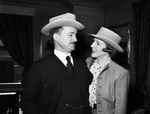 Mr. and Mrs. Alfred Duff-Cooper. The couple are standing close and are looking into to each other's eyes. Mrs. Duff- Cooper is wearing a suit with an inner polka dot blouse and a hat while Mr. Duff-Cooper is wearing a suit, vest, inner collared shirt, tie, and a hat.