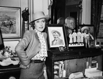 Mrs. Duff-Cooper is wearing a suit with an inner polka dot blouse and a hat. She is standing beside a shelf with framed photographs of Will Rogers and Amon Carter. There is also a figurine of the Carter family in their overcoats. She has her right hand on her waist and the other hand dropped to her side