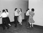Image shows Students in Fort Worth, Texas public schools are no longer dragging their feet when it comes to dancing in physical education classes. Students at W. C. Stripling Junior High School are hopping through the Schottische. They are left to right, Charlotte Cline, Roy Harpold, Peggy Whitehead, M. L. McKay, Anne Burkette, and Tommy Keen. A couple of rounds like this clear the brain in preparation for Latin quizzes and mathematical twisters. Published in the Fort Worth Star-Telegram morning edition, February 4, 1940.