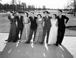 Image shows Students in Fort Worth Texas public schools are no longer dragging their feet when it comes to dancing in physical education classes. Students from Riverside High School are performing the Ten Pretty Girls Step. The are left to right, Onieta Ore, Ben O. Keeton, Billie Hodges, Jack James, Glydeen Butterfield, Lorayne Griffin, Frankie Bess Williams, and Ben Reeves. The group is standing in a line with their arms linked and their right legs raised. The boys are dressed in suits and the girls are wearing gowns. They are dancing outdoors. Published in the Fort Worth Star-Telegram morning edition, February 4, 1940.