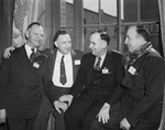 The Southwestern Exposition and Fat Stock Show's good will tour stopped in Oklahoma City, Oklahoma. Left to right are, Charles H. Moureau, C. K. Fletcher, Reverend W. R. White, and G. J. Post. The group is posing on a window sill. Mr. Moureau, of Oklahoma City, is governor of the Texas-Oklahoma Kiwanis District. He is wearing double breasted suit. Mr. Fletcher is with the Fort Worth Kiwanis. He is dressed in a suit. Reverend White is the pastor of Broadway Baptist Church. He is wearing three piece suit. Mr. Post is the chairman of the Good Will Trip. He is dressed in a double breasted pinstripe suit.