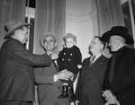 The Southwestern Exposition and Fat Stock Show's good will tour stopped in Gainesville, Texas. The boosters are left to right, John M. Hendrix, Captain Tom Hickman, J. L. Webb, and Bob Calen. Captain Hickman is holding his son, Tom R. Hickman. Mr. Hendrix is director of special events at the stock show. He is wearing a cowboy hat and a suit. Captain Hickman is a Cooke County deputy Sheriff and a former Texas Ranger. He is wearing a cowboy hat and a suit. Tom Junior, two-and-half, is dressed in a cowboy hat, coat, and cowboy boots. Mr. Webb is President of Gainesville Kiwanis Club. He is wearing a three piece pinstripe suit. Mr. Calen is a rodeo roping star. He is dressed in a cowboy hat, and a dark suit.