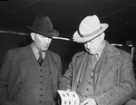 An auction for John B. Stribling & Son's herefords is being held at the Stribling Ranch. Some of the earlier arrivals to the ranch near Rotan, Texas are left to right, D. L. McDonald and H. I. Fox. The men are looking through the offerings in the Stribling catalog. Mr. McDonald, of Hereford, Texas is wearing a hat and a three piece suit. Mr. Fox, of Wichita, Kansas, is dressed in a hat, three piece suit, and a coat. Published in the Fort Worth Star-Telegram morning edition, February 6, 1940.